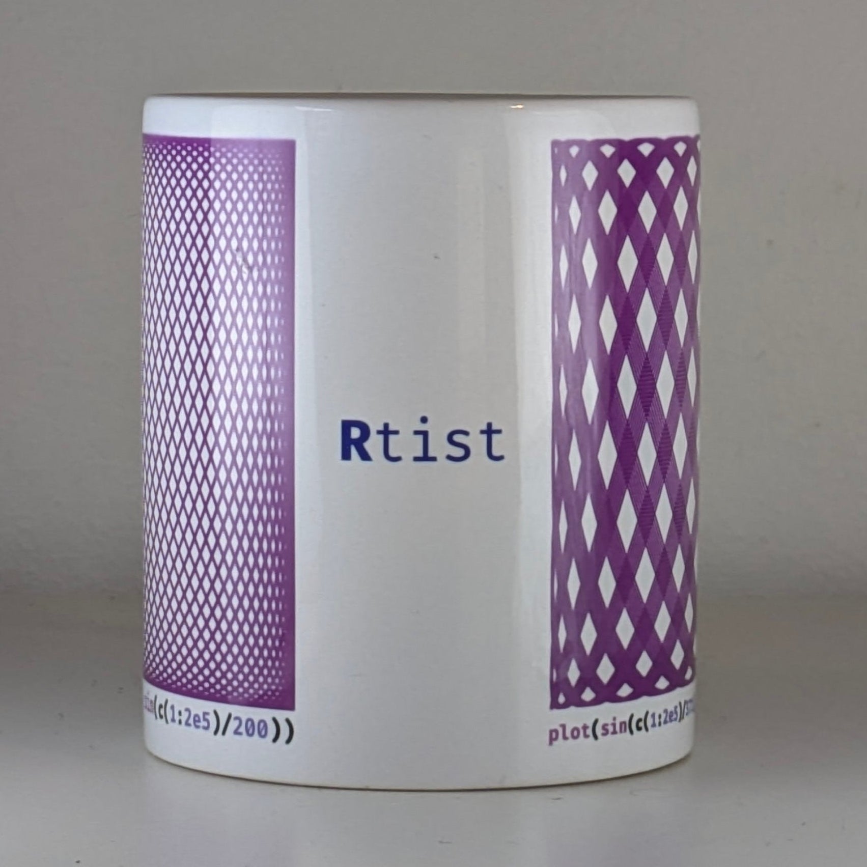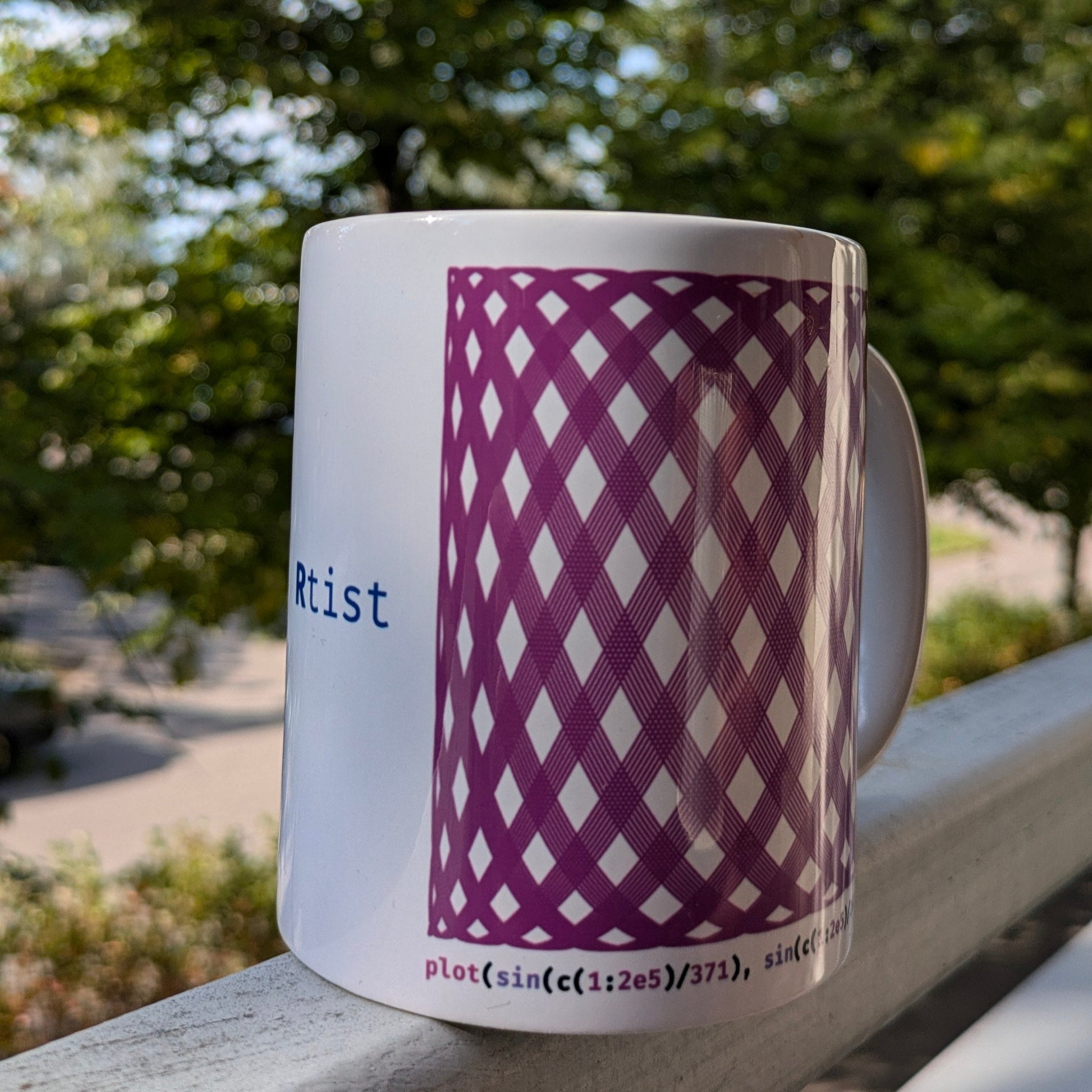 The Mesh and Pillow-patterns on the mug consist of 200 000 points. Both of the patterns are created by a single line of code, where the locations of the points on a 2D plane are determined by trigonometric functions. The design is printed on the mug in Europe by Printful.